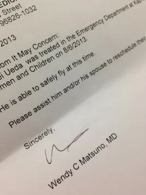 デルタ航空が必要と言っていた手紙([中編]参照)のことは、主治医ほか診察してくれた医師3〜4人に伝えてあったのですが、帰ってよいと言われた時にもらったのは処方箋のみ。