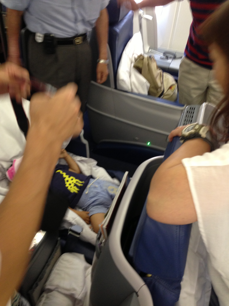 この後、着陸までの5時間点滴となれば、主人が抱っこしたままでは大変だろうとのことで、デルタ航空のご厚意でビジネスクラスの空いた席を使わせていただきました。